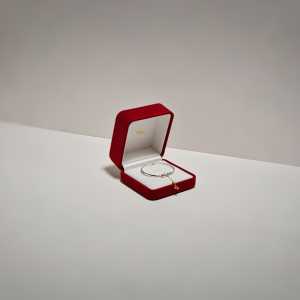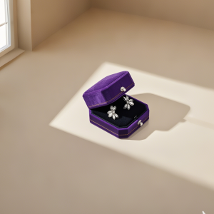 Kotak liontin berwarna ungu violet yang memancarkan kesan elegan dan berkelas, dilengkapi dengan lapisan kain hitam lembut di bagian dalam untuk melindungi sekaligus menonjolkan keindahan perhiasan Anda.